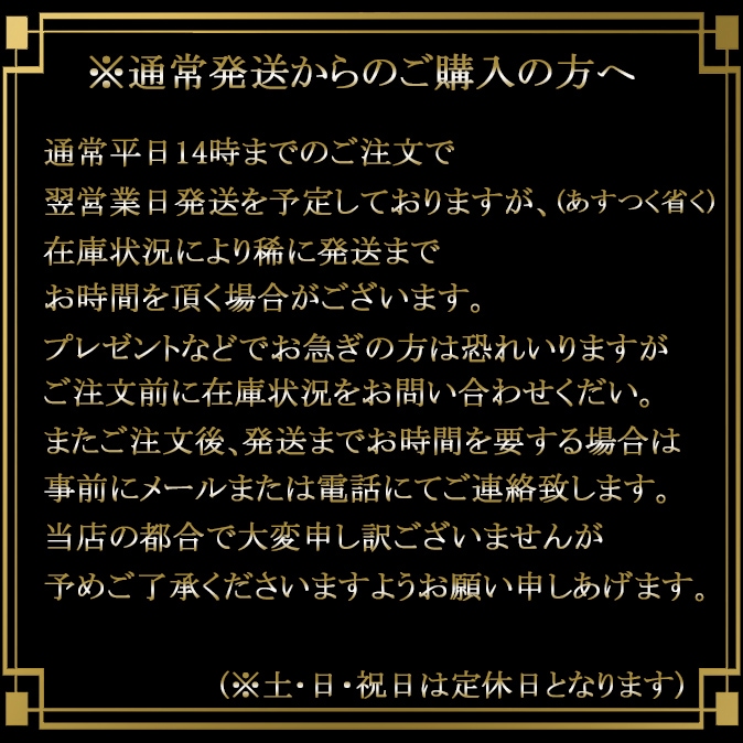 | ※注意※ | サイズ・グラムは入荷時期により多少の誤差がございます。 在庫状況はシステムの更新タイミングにより 実際の状況とはことなる場合がございます。 プレゼント等でお急ぎの方はお手数ですが1度お問い合わせくださいませ。 ご注文後在庫切れの場合はこちらからご連絡させて頂きます。 申し訳ございませんが予めご了承ください。 |